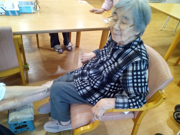 シニアセラピーはごま油とティーツリーオイルを使って脚をマッサージしていきます♪