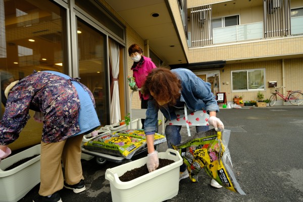 ご利用者さま&スタッフみんなで協力して手際よく植えていきます(*^^)v