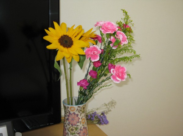『この花生なの?』そうです。 綺麗ね、いつも悪いね!とお花を見つめていました。ひまわりもあるね?とお話ししました( ^ω^)・・・ 居室に飾りお部屋でも楽しみました!!