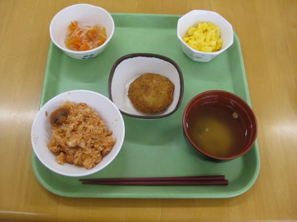 チキンライス・スクランブルエッグ・カレーコロッケ・玉ねぎと人参のマリネの昼食のメニューです!! みなさま、『最高に美味しい、美味しいね』と完食されていました( ^ω^)・・・
