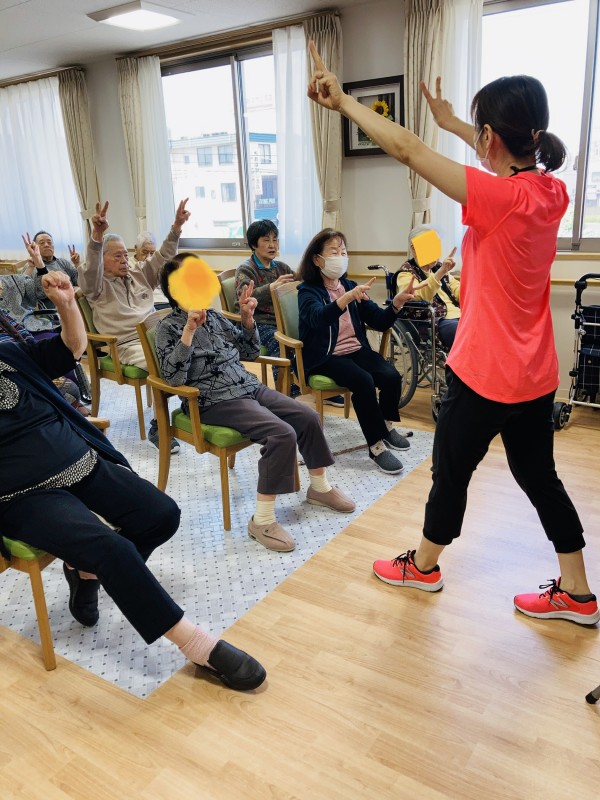高橋先生によるノーアエクササイズ、皆さん手足を広げたり、足踏みをしたり、声を出しながら脳トレを兼ねた体操を頑張ります。最後はリズムに合わせて先生の掛け声のもとしっかり身体を動かしました。