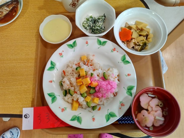 この日の昼食メニューは、折り紙の鯉のぼりが飾られた特別食でした♪