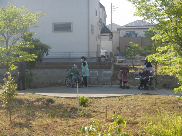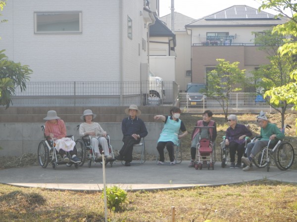 この日も五月晴れの中、ご利用者様と散策をして、途中休憩で井戸端会議を開きながら、目の前の新緑と薫る緑風を楽しみました。