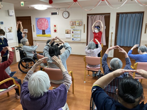岡庭講師に引き込まれて一生懸命な表情や、楽しそうに満面の笑みの方とそれぞれですが、利用者様はリズムについていき、生き生きと体操をしていました!(^^)!