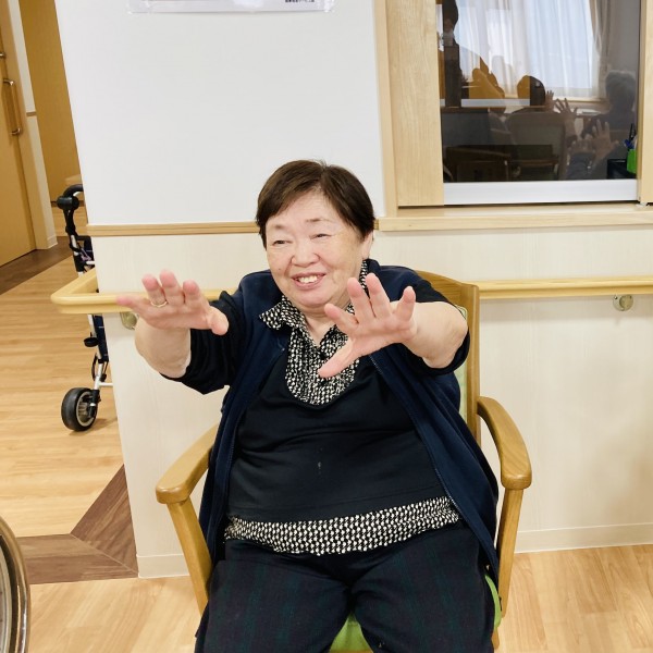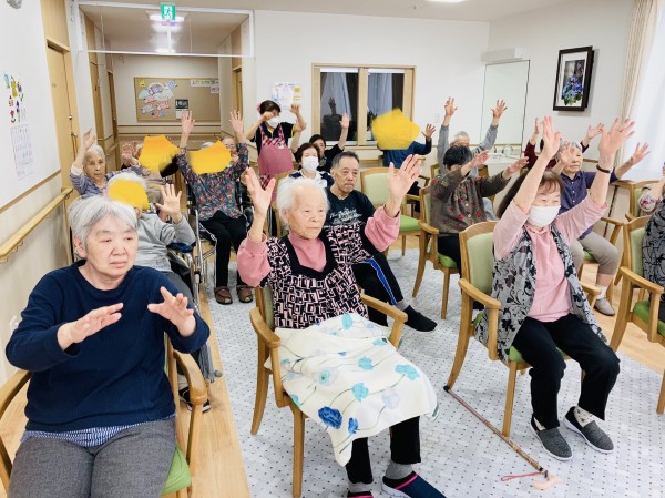 皆さん声を出しながら手拍子をしたり、腕も足もしっかりあがります!毎日フロアで行う体操と違い、他のフロアの皆さんと一緒に参加するので、賑やかな雰囲気でとても楽しい時間になっています♪