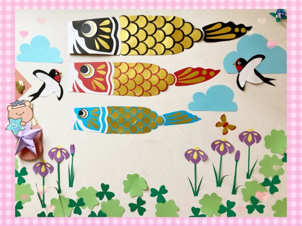 菖蒲の花の上を鯉のぼりが仲良く泳いでいます。