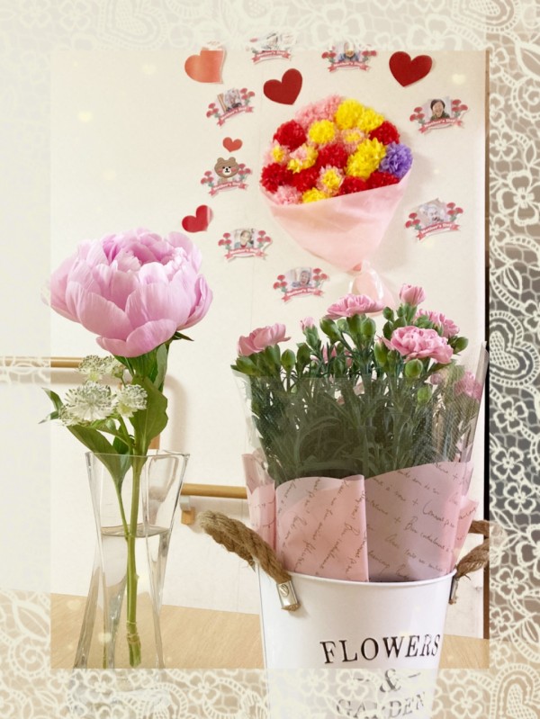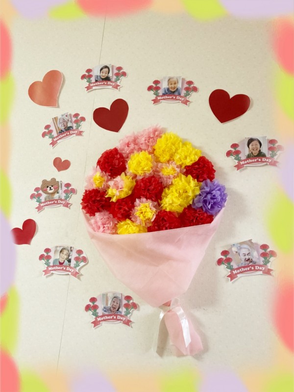 職員もみんなでお花紙でカーネーションを作り花束にして利用者様にプレゼントの壁紙を作りました。いつも本当にありがとうございます。