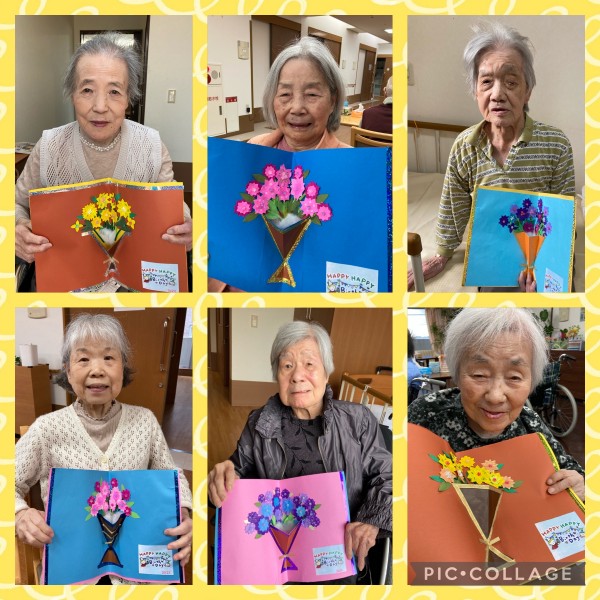 その代わりといってはなんですが、今回2月、3月生まれの方に手作りカードのプレゼント!職員のSさんにお願いして花束のカードを作ってもらいました。想像はるかに上回る素敵なカード☆彡 私も欲しくなってしまいました(笑)