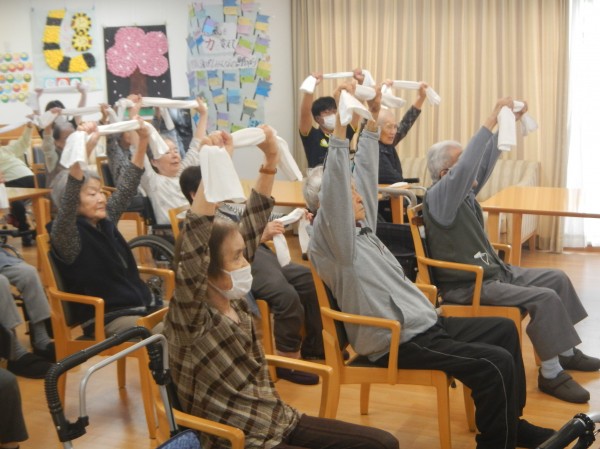 ホールに集まったご利用者様は、椅子に座りタオルを握りしめ準備完了!
