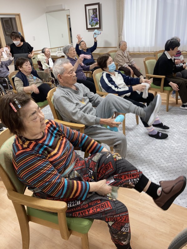 高橋先生指導のもとタオルを足の下にくぐらせたり、タオルを両手で持ったま前屈して腰を伸ばしたり、タオルを上に投げてキャッチ!と楽しい体操が続きます。皆さん慣れた様子でタオルを上手に使っています。