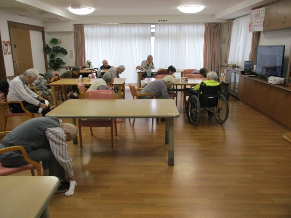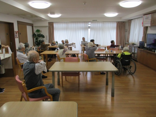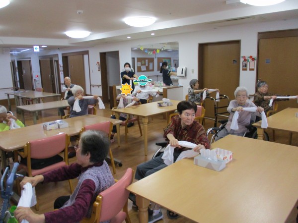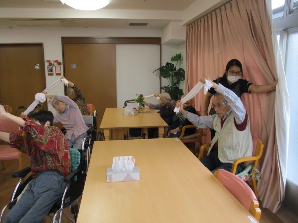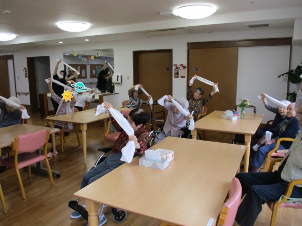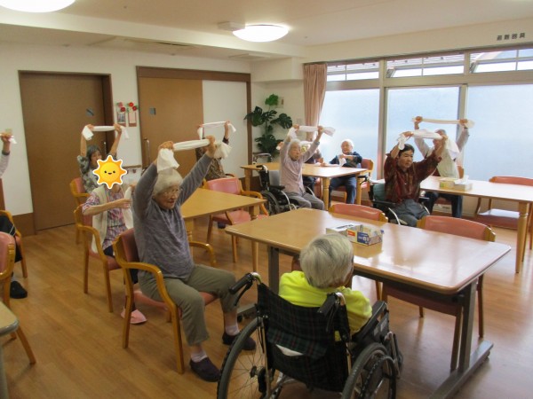 1〜3階の入居者様合同でタオルを使った運動を行い