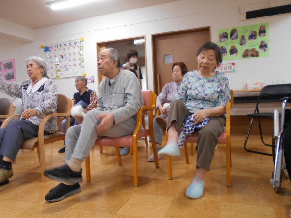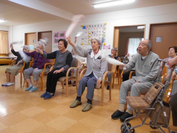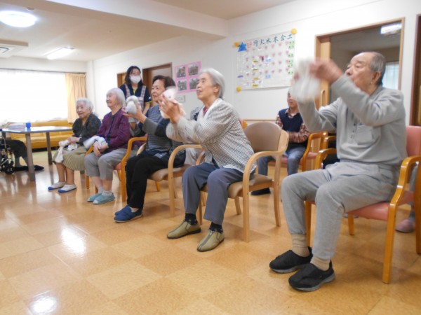 普段の指先や足を動かす体操とは少し違い、タオルを使用して畳んだり結び目を作って上へ投げたりと変わった運動に皆様楽しまれながら体操をしていました(^^)/