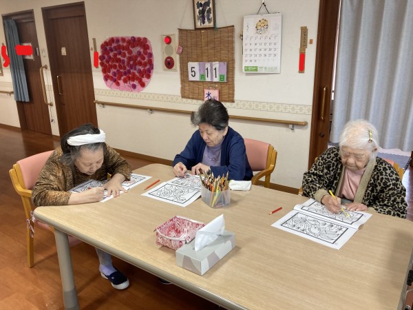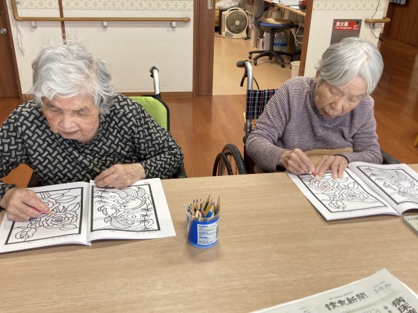 10数年ホームで暮らしている利用者様は「もう何年もやってきたから…」と塗り絵をやらないことが増えてきたんですが、この日は皆さんが塗り絵をしているのを見て、自分から塗り絵と色鉛筆に手を伸ばしていました(#^.^#)