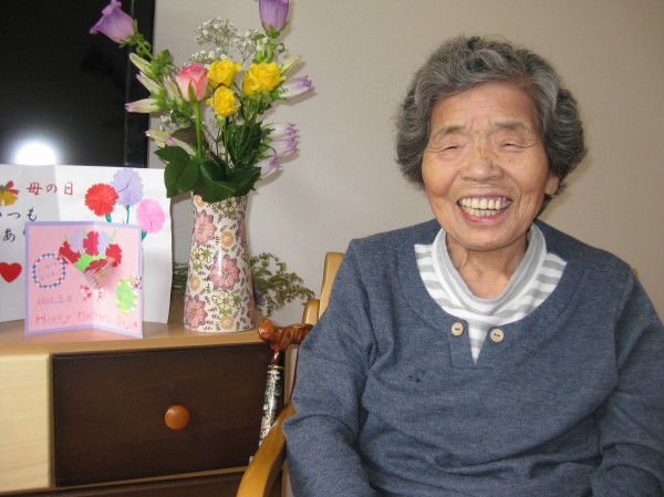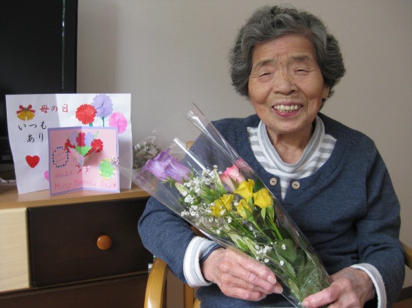居室で写真を撮りました。笑顔が素敵ですね( ^ω^)・・・ 最高の笑顔です。お花があると嬉しそうです!!