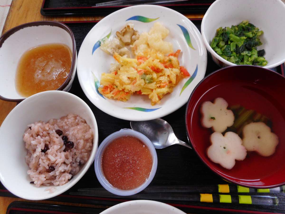 赤飯、清汁、天ぷら盛り合わせ、菜の花のゆず味噌和え、いちごゼリーです。