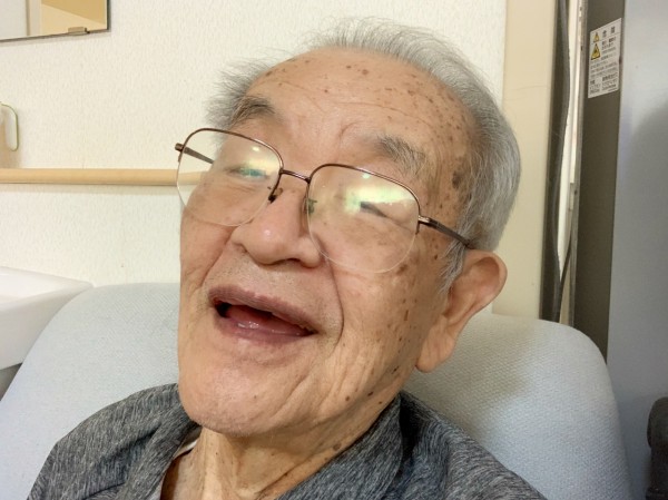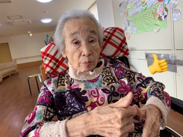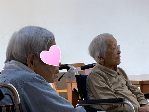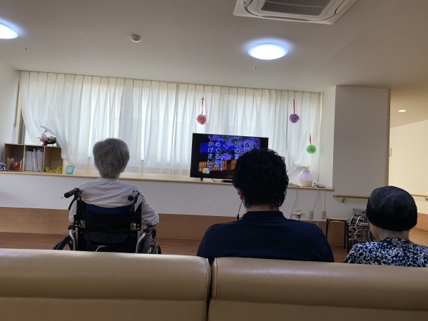 歌うご入居者様とタブレットに記録をしている職員の後ろ姿。