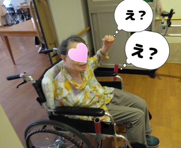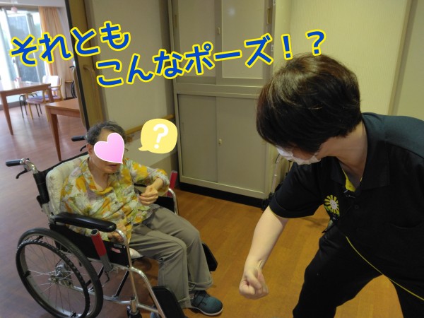(ホーム長の勢いに戸惑いながらもマネをされるご入居者様…)