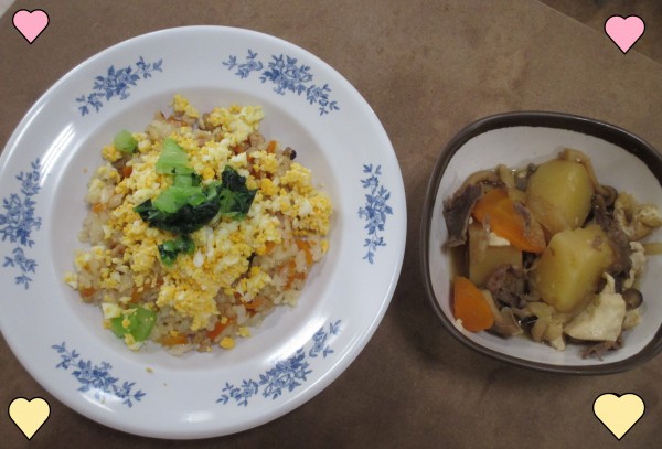 サイドメニューはホーム長お手製の肉じゃが(*^▽^*)!それから汁物を添えて・・・・・「いただきま~す!」