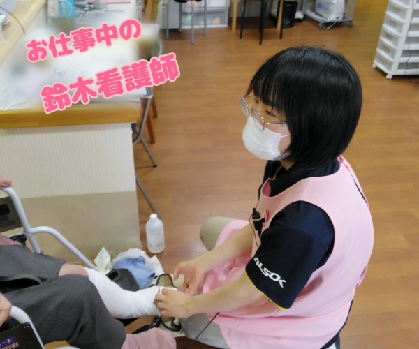 鈴木看護師が、ご入居者様のおみ足に包帯をぐるぐる…