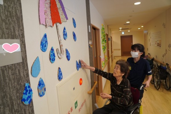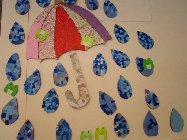 今回は、前回の作成途中だった「梅雨‼」を表現した可愛いパラソルや雨粒を壁に飾り付けをいたしましたぁ\(^^)/