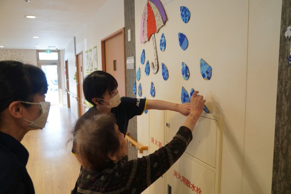 ご利用者の皆さんで一生懸命に作成した個々のパーツを壁に貼っていきます(^^♪