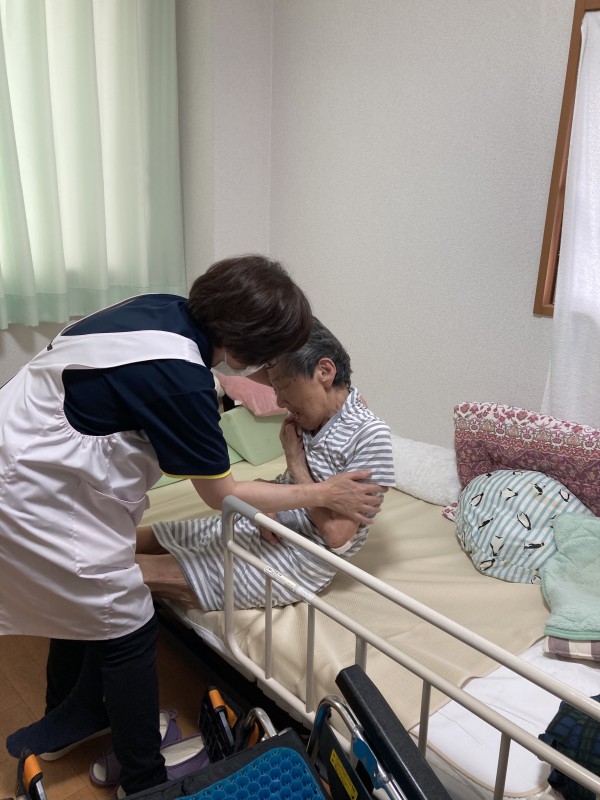 車椅子利用者様をベッドから車椅子へ移乗。火元から一番遠い居室へ誘導。消防隊の救助を待ちます。