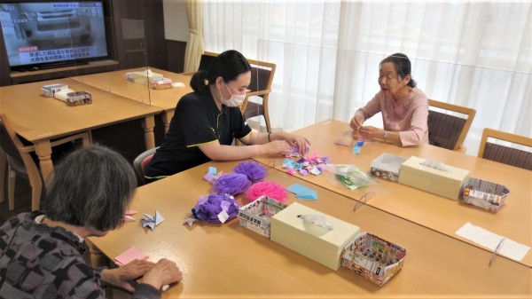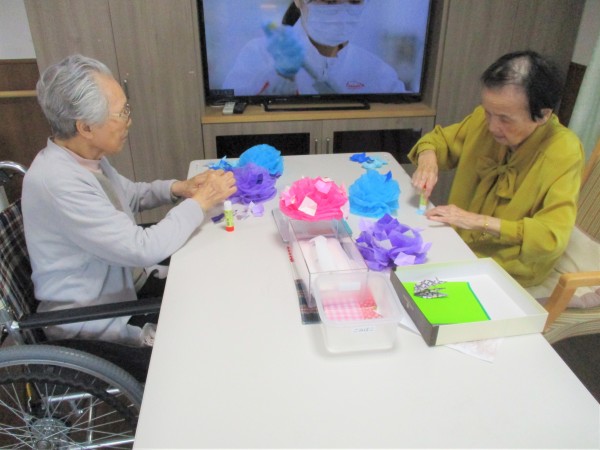 6月はホールの壁を紫陽花で飾ります。今皆さんで沢山の紫陽花をつくっています。