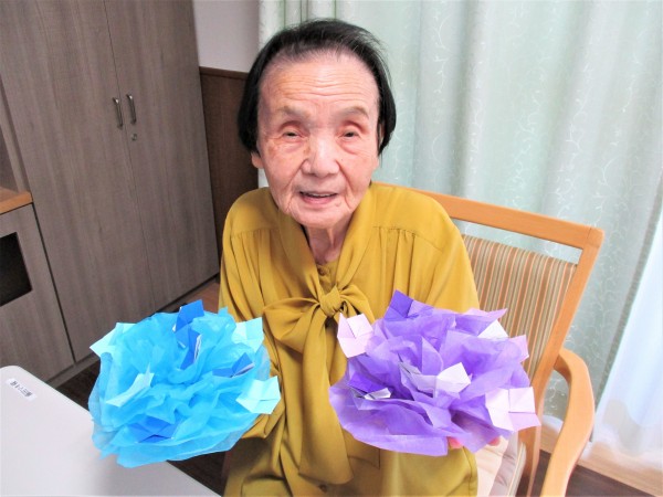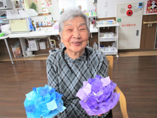 ピンク・水色・紫色の3色の紫陽花です。職員も一緒に各階が競って作っています。