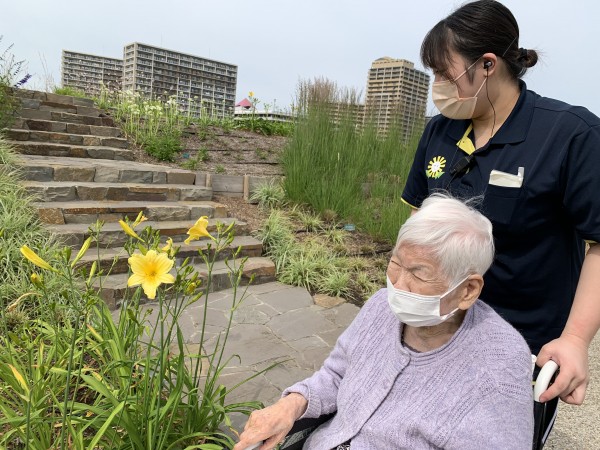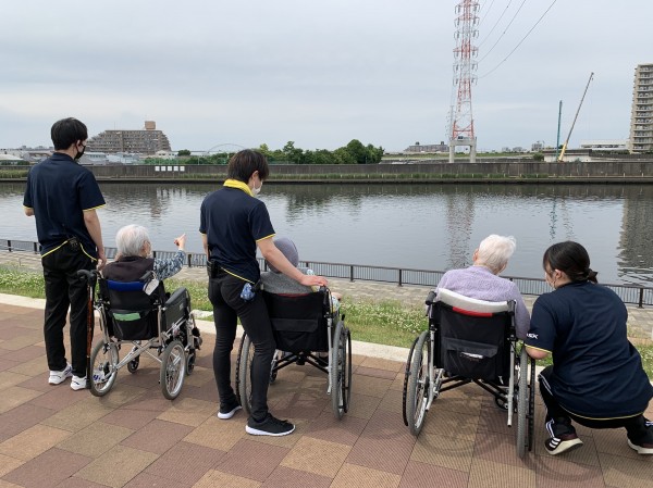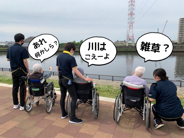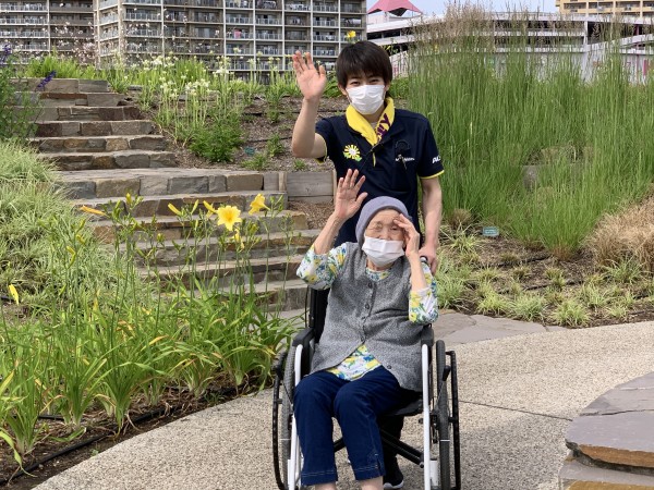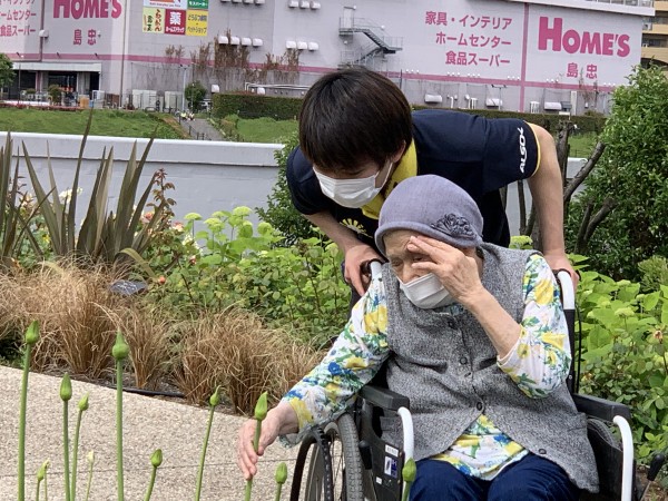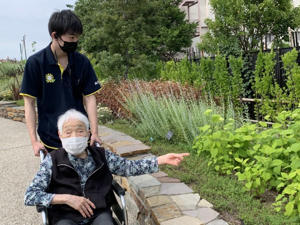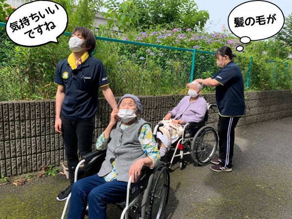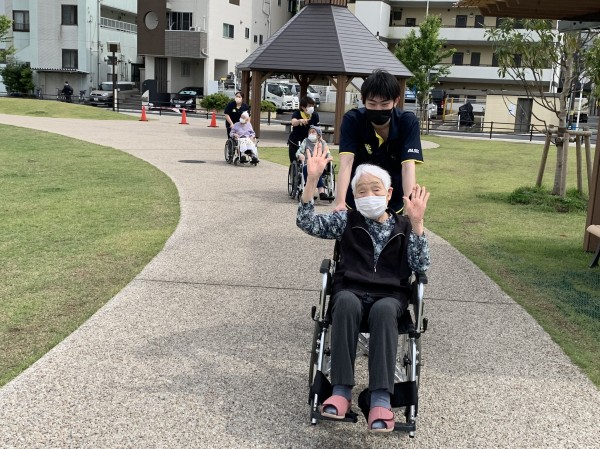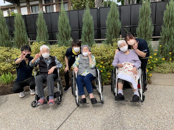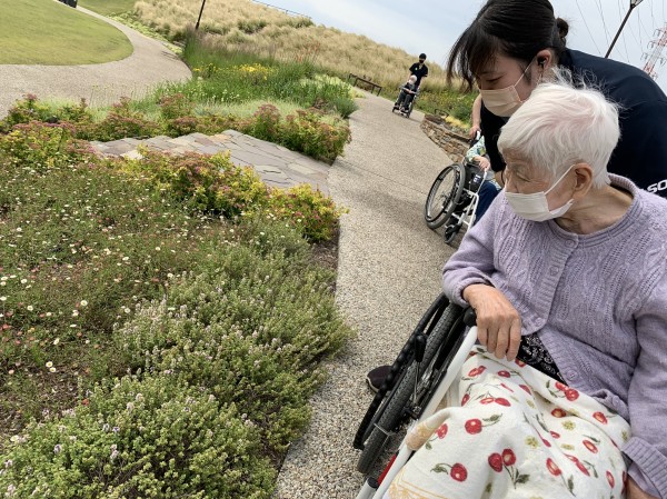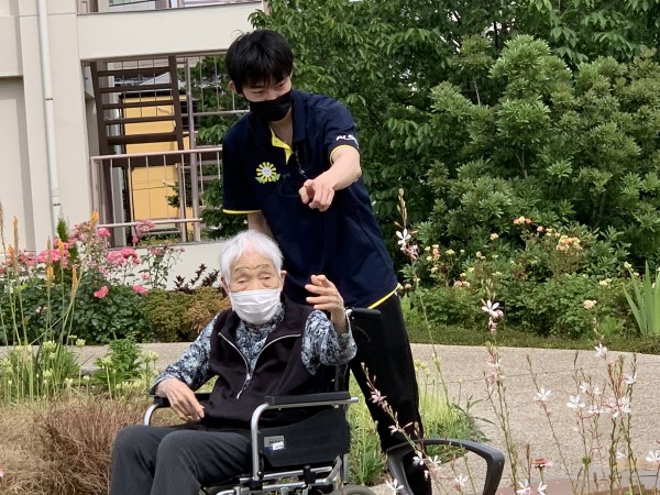 ご入居者様に、久しぶりのお散歩を満喫していただきます。