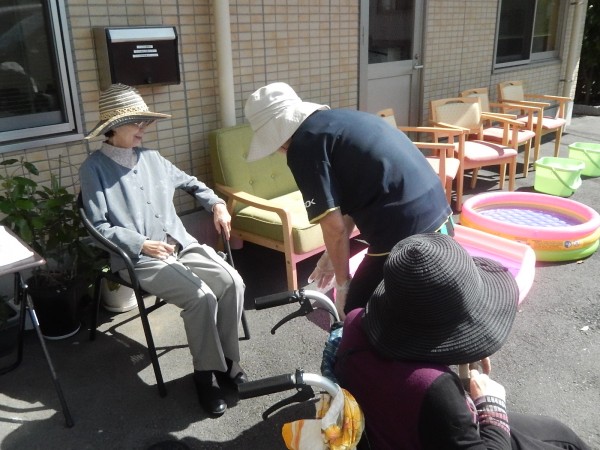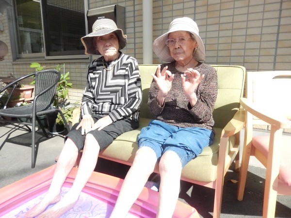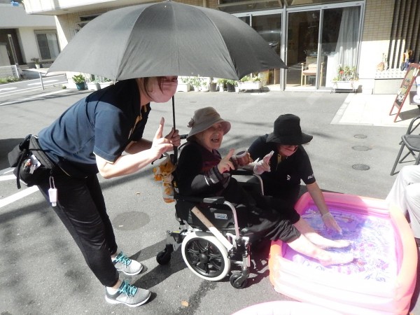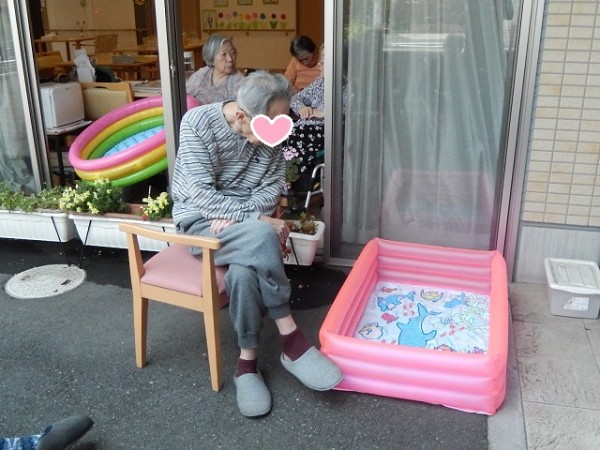 水を張ったプールに足を入れると「冷たいっ!でも気持ちがイイ‼」と笑顔(^O^)