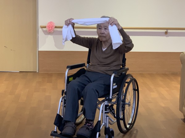 シッカリと30分ちょっとタオル体操をされ、前に出て一緒に体操をしていた職員に聞くと