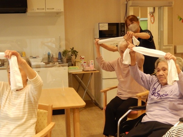 本日、お風呂の順番待ちの時間に「A(あんしん)K(かんたん)トレーニング“タオル体操”」を行いましたぁ(^^♪