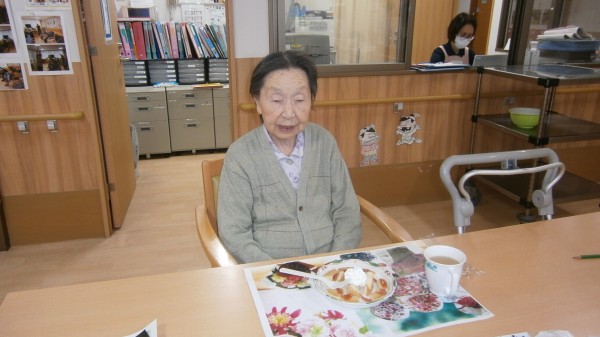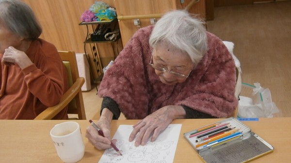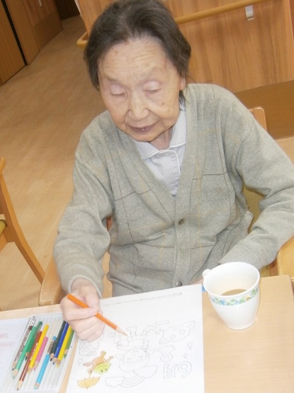 食べてばかりではありません! 脳トレ、体操、歩行練習、、、etc         体も頭も頑張ってます。今日はぬり絵です。皆様真剣にとても美しく塗り絵をされます('ω')ノ