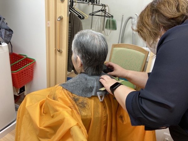 二か月に一度の訪問理美容。ショートカットのご利用者様が多いので、「いつ来るの?」「こんなに伸びちゃったよ」と待ち侘びていました。カットだけの方、ヘアカラーの方、それぞれご自分の番を楽しみに待ちます。カットが済むと鏡を見て、にっこり。さっぱりしましたね、との声かけにさらに、にっこり!