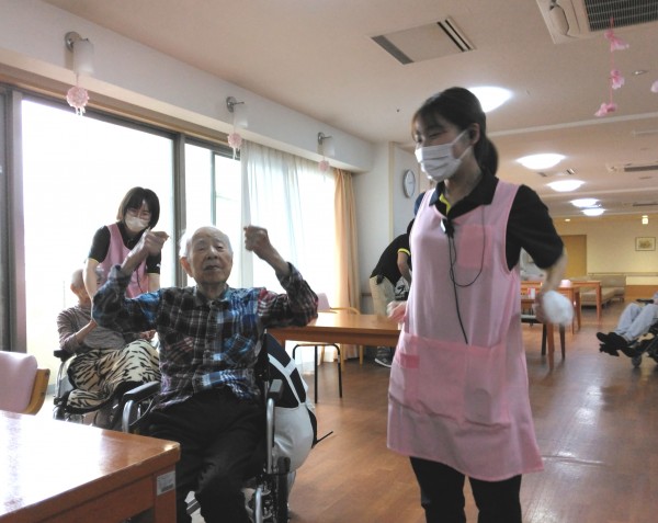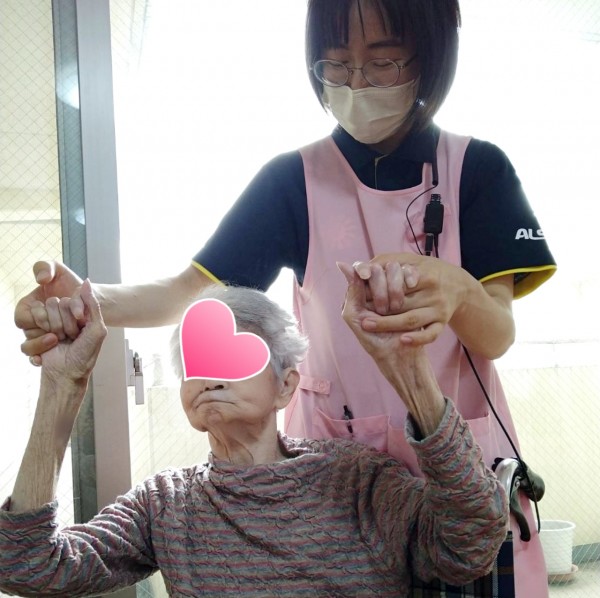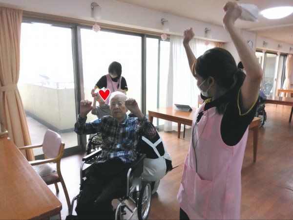 こちらでは、鈴木看護師がご入居者様と手をとりあい、一緒に体操です(^^)