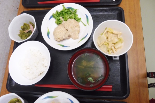 今日のランチでは盛り付け、コンソメスープの中身はレタス、カニかまぼこ、エノキ。