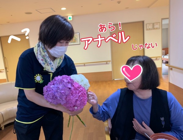 お花がお好きなご入居者様が、白い紫陽花を見て