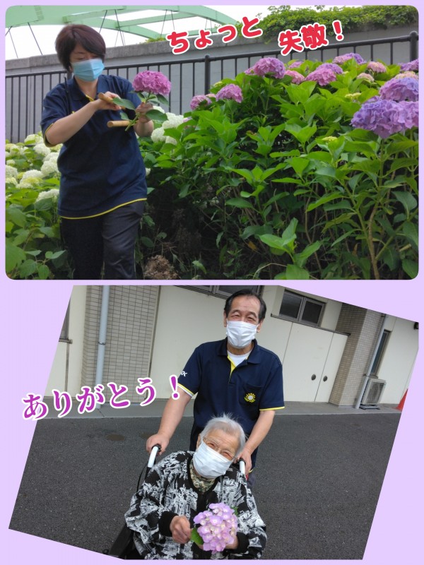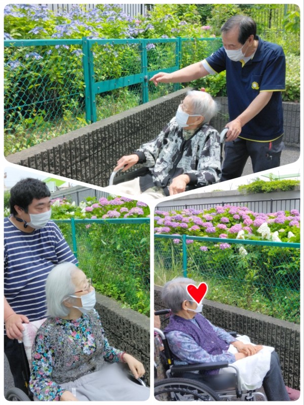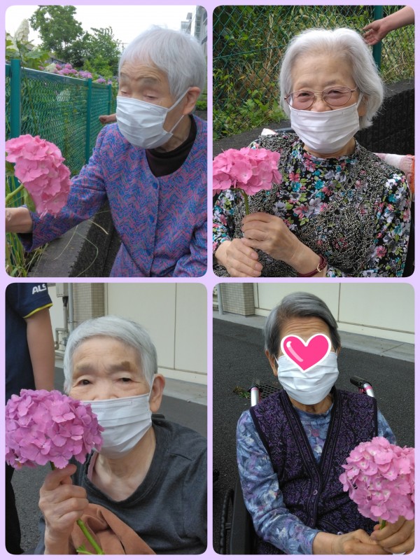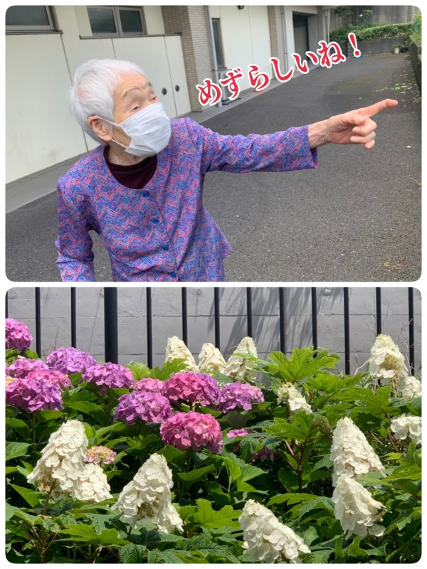 白いとんがり三角の紫陽花を見て、102歳様がびっくり!