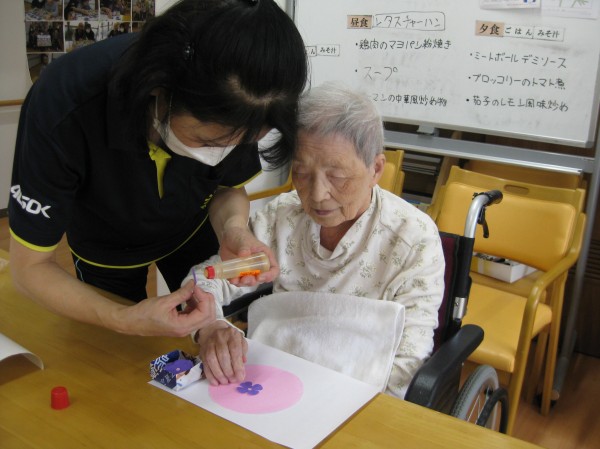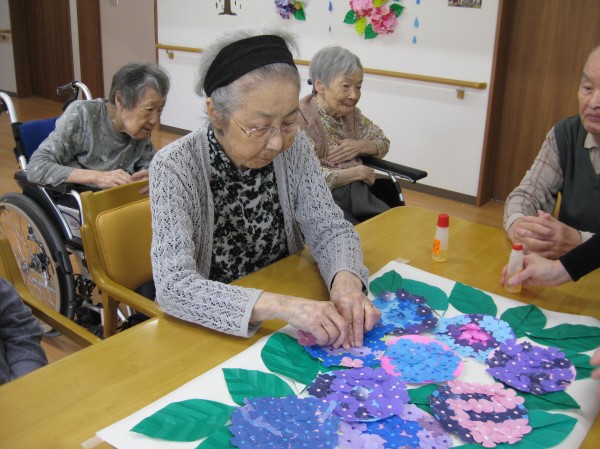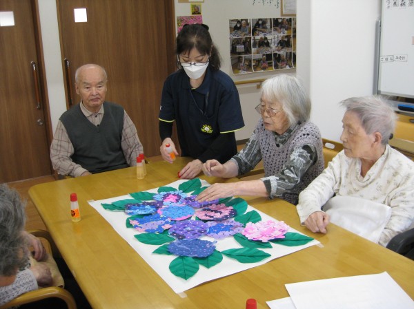 こんにちは!グループホームみんなの家・あきがせの介護ブログです!よろしくお願いいたします。今日は6月お花「あじさいの花」の貼り絵をした時の様子をご紹介します!!