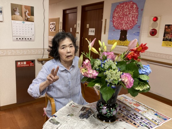 ボランティアの方にキレイな花を頂いたので、さっそく花の大好きな利用者様に生けていただきました♪