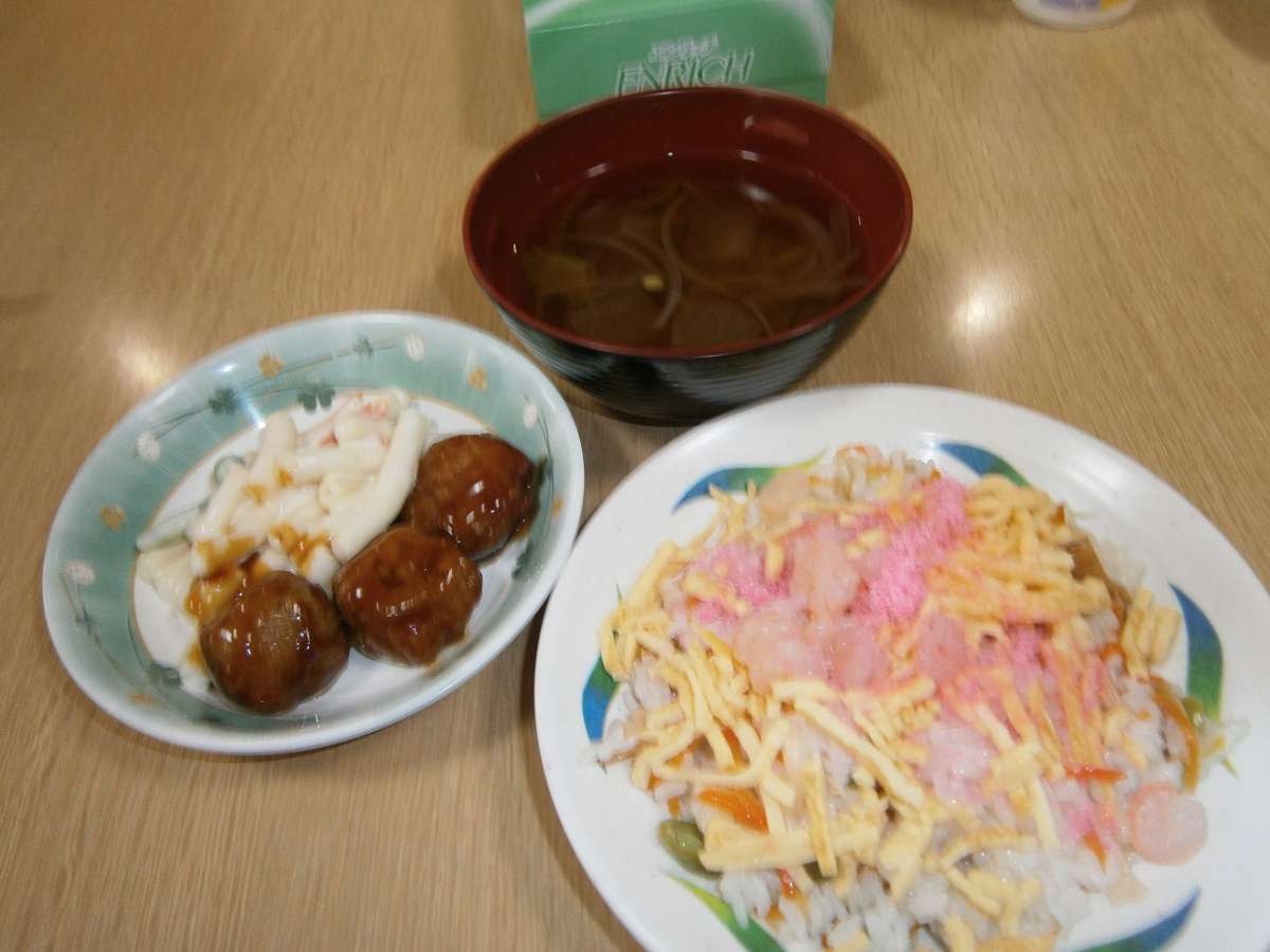 本日のメニューは春らしく、ちらし寿司(えび入りでした♡)と肉団子、マカロニサラダ、すまし汁です。