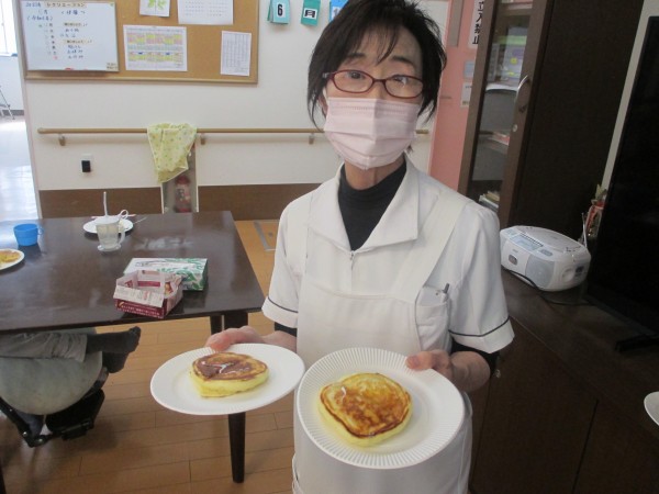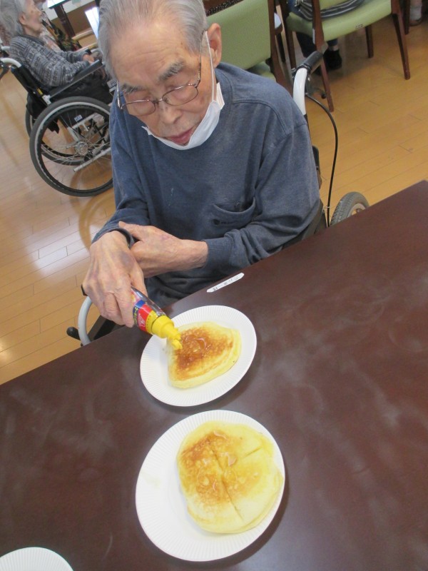 リモート体操が終わった後は、ホットプレートを使ってパンケーキレクを行いました(*^-^*)♡利用者様にお手伝いしてもらいながら☆メープルシロップをかけて♡
