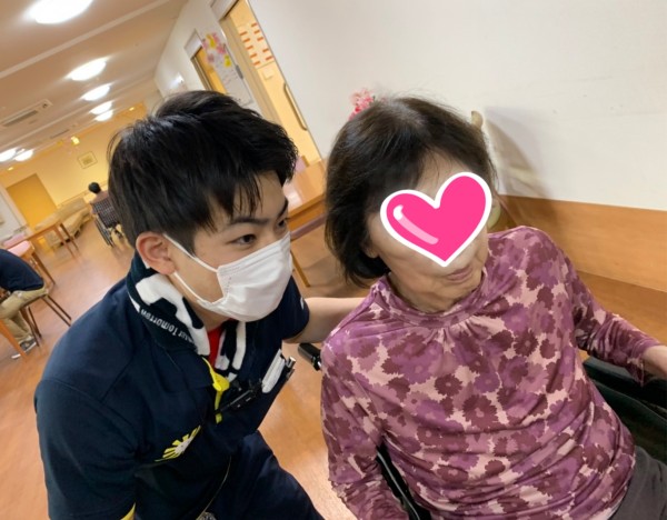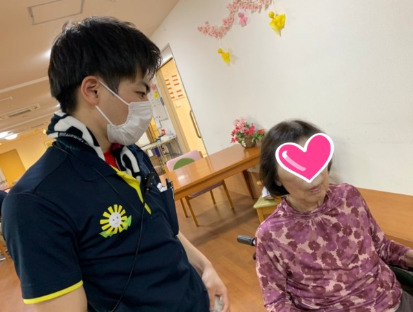 体操の後に、ご入居者様へお声かけする小西ケアスタッフ。