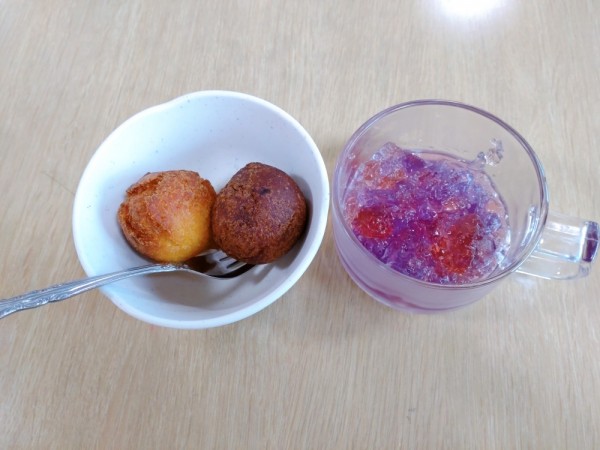 綺麗な紫陽花ゼリーとあたたかいサーターアンダギー