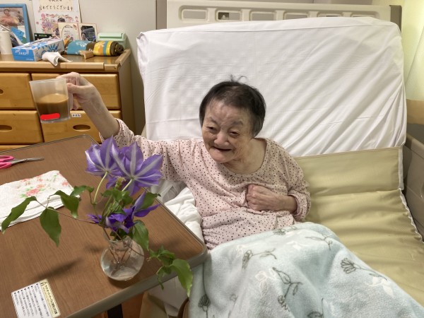 「テッセン」が大好きな利用者様の居室へ飾ると、とても喜んで下さり「こんないい景色でコーヒーを飲めるなんて幸せです」と仰り満面の笑みを見せてくれました。