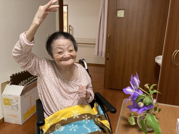 体調面で居室対応の利用者様で、認知症も進み対応が難しい時もありますが、こうして利用者様が好きな花を飾ったりすることでとても喜んでくれ、職員も嬉しくなります。
