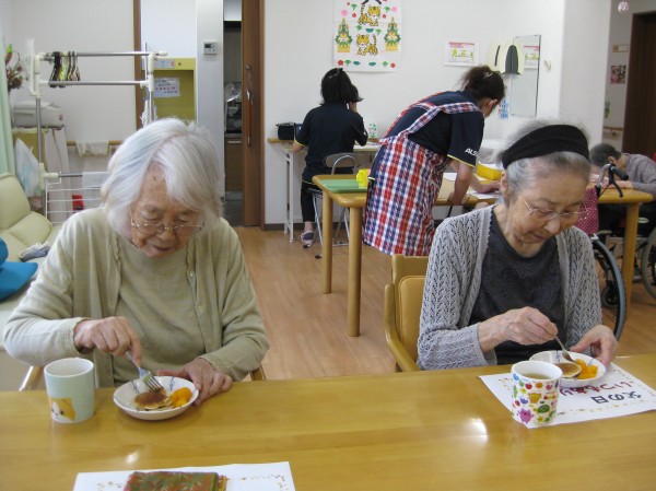 職員がおやつ作りで「どら焼き」を作っている様子です。 美味しいと完食されています( ^ω^)・・・