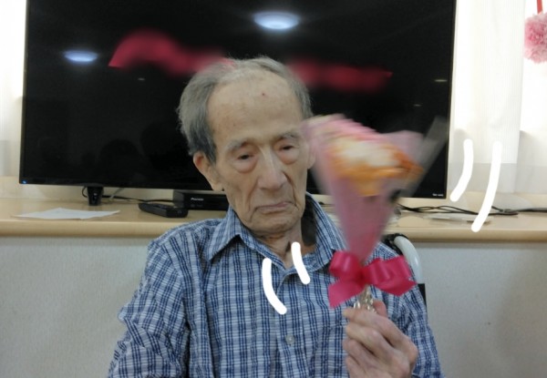 眠気と闘いながらも、受け取られた花束を振って皆様の声援に応える102才様。