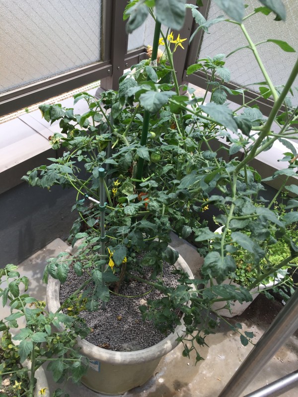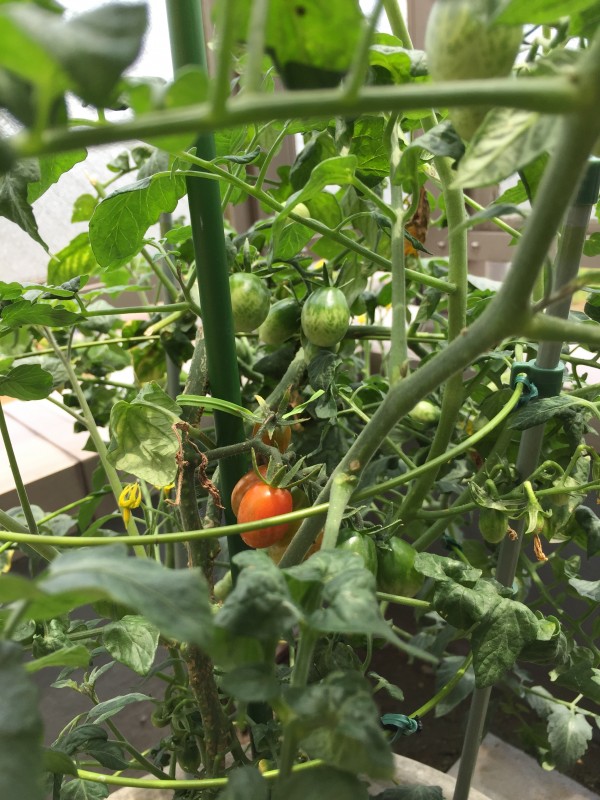 現在、緑色のミニトマトがたくさん出来てきています。