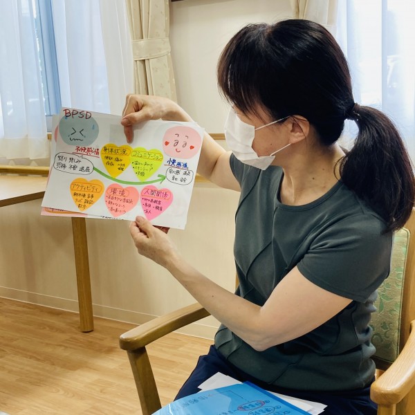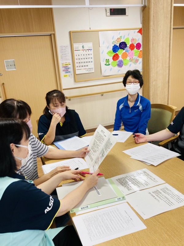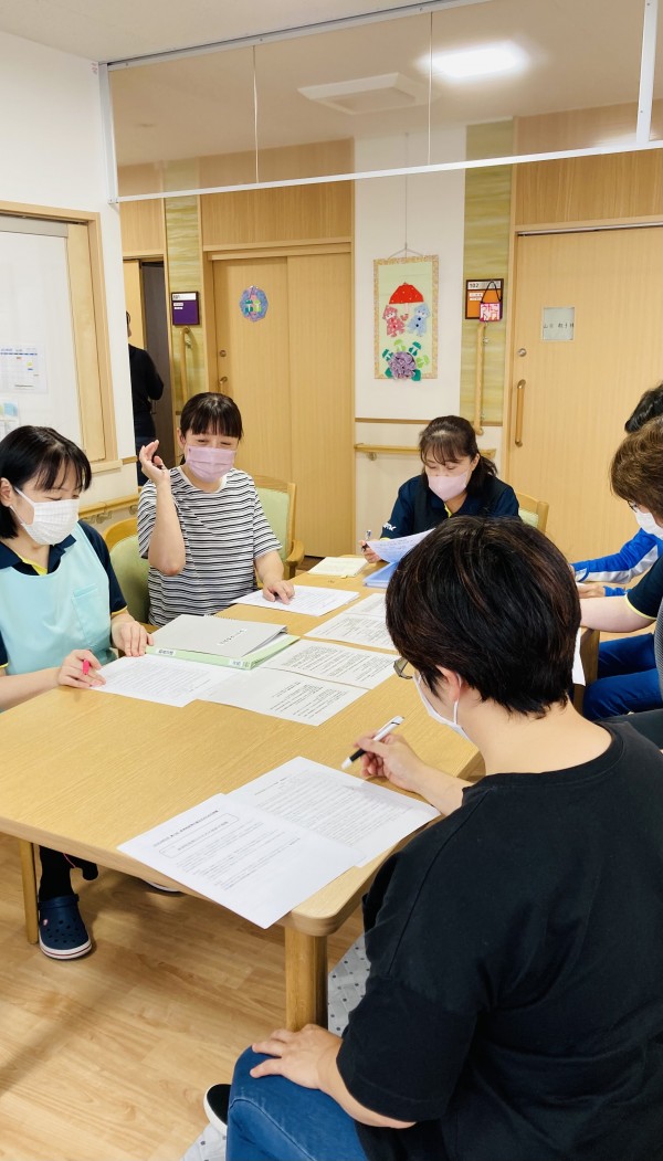 本日は月に1度の職員会議。各フロアの状況報告や情報交換はもちろん、利用者様が日々安心して笑顔で過ごせるために認知症について学び、より良い介護が出来るよう意見を出し合う大切な時間でもあります。